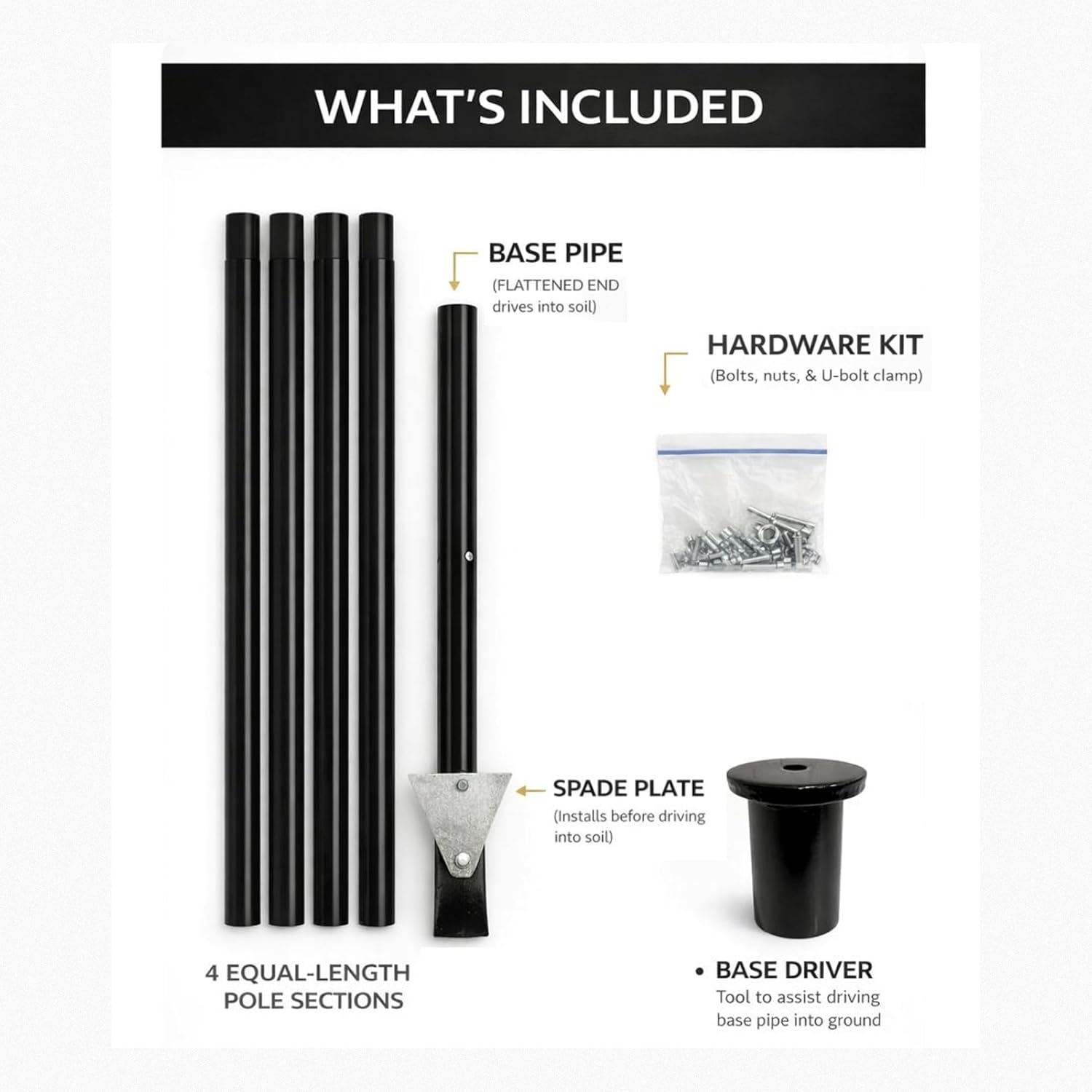 | Included Components | Pole Segments, Base Piece, Spade Plade, Base Driver, Hardware |