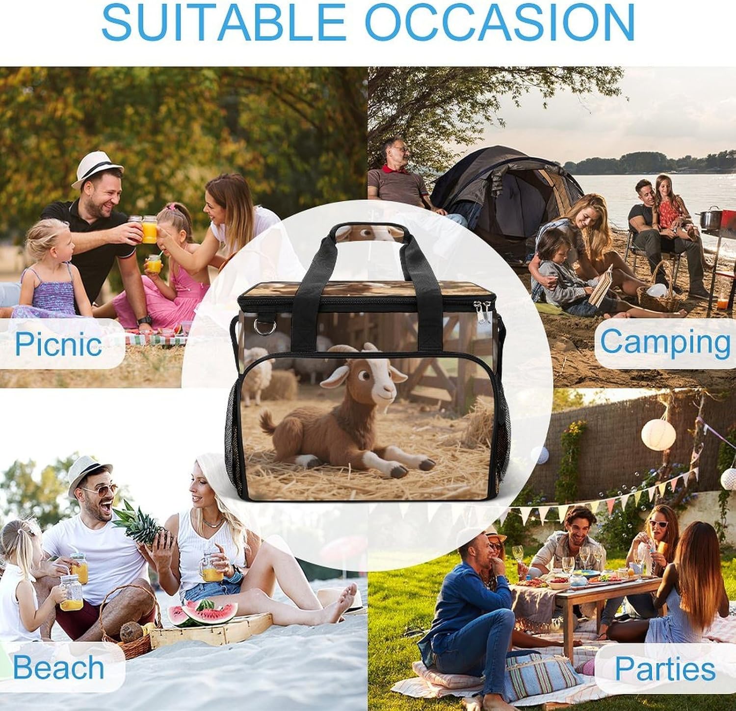 Take Your Meals Anywhere with Farm Animal Cute Goat Grocery BagsFood Container Carrier Oxford Fabric Picnic Bag Heat Retaining Food Bag Camping Cooler BBQ Accessories Cute Picnic Bag with Pockets Insulated Food Bag for Work Insulated Lunch Tote Bag Camping BagTemperature Control That WorksThe upgraded aluminum foil lining creates an effective thermal barrier. Your drinks stay refreshingly cold, and your hot dishes maintain their warmth for hours. No more lukewarm meals during outdoor outings.Thoughtful Storage DesignTwo side mesh pockets - Perfect for water bottles or umbrellasFront zippered pocket - Keeps keys, phone, or condiments organizedInternal mesh pocket - Stores utensils, napkins, and small essentialsMain compartment - Spacious enough for food containers and snacksBuilt for Daily AdventuresConstructed from high-density oxford fabric with reinforced stitching at stress points. The double zippers are sturdy and smooth-operating. Reinforced handles let you carry heavy loads with confidence.Carry Your WayHandles for quick grabbingStands upright for easy packing and accessPerfect For:Picnics in the parkBeach days and pool partiesCamping and hiking tripsOutdoor concerts and festivalsDaily work lunchesGym and fitness classesRoad trips and travelGrocery shoppingSpecifications:Dimensions: 15.4 x 11.8 x 11.8 inchesMaterial: High-density Oxford fabricLining: Aluminum foil (insulated)Closure: Sturdy double zippersPockets: 2 side mesh, 1 front zipper, 1 internal meshCare: Hand wash or machine wash, do not bleachNote: Food containers and utensils shown in images are not included.