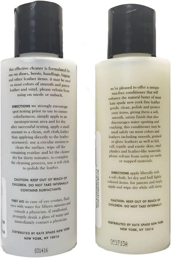 [leather cleaner]4 fluid oz deep cleans smooth leathers, patents and vinyls, not for use on suede, nubuck or napped finishes, good for all colors. apply small amount to clean cloth, do not apply directly to leather, use a circular motion to clean, wipe off excess residue and let dry for 30 minutes, for best results use kate spade leather conditioner after use recyclable plastic container with turret dispensing cap made in usa [leather conditioner]4 fluid oz unique wax-free formula that leaves a soft satiny finish and enhances the natural lustre apply liberally with a soft cloth, let dry and buff lightly, wipe dry on patents and vinyls recyclable plastic container with turret dispensing cap made in usa