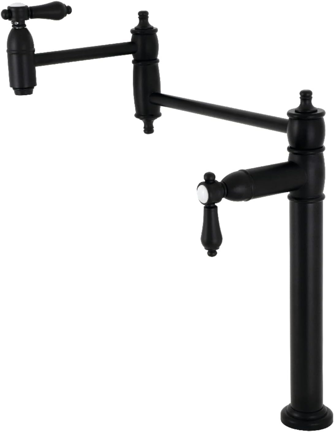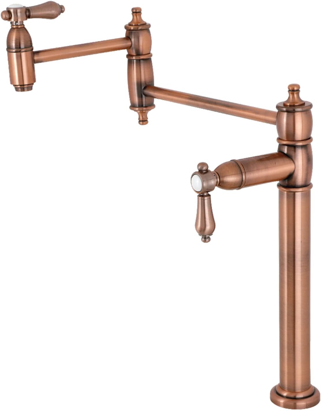 Soft simplicity meets refined craftsmanship through this faucet. As an excellent tool to quickly, easily, and stylishly fill the pots directly on or next to the stove, eliminate strain on your joints. Deck mount pot fillers are useful gadgets placed directly on the countertop, providing easily accessible water. The foldable swing arms of this pot filler allow for extendable reach of up to 20" of length and provide long-lasting function due to their sturdy brass construction. Additionally, the dual handles prevent unwanted water spillage while enhancing the traditional theme.