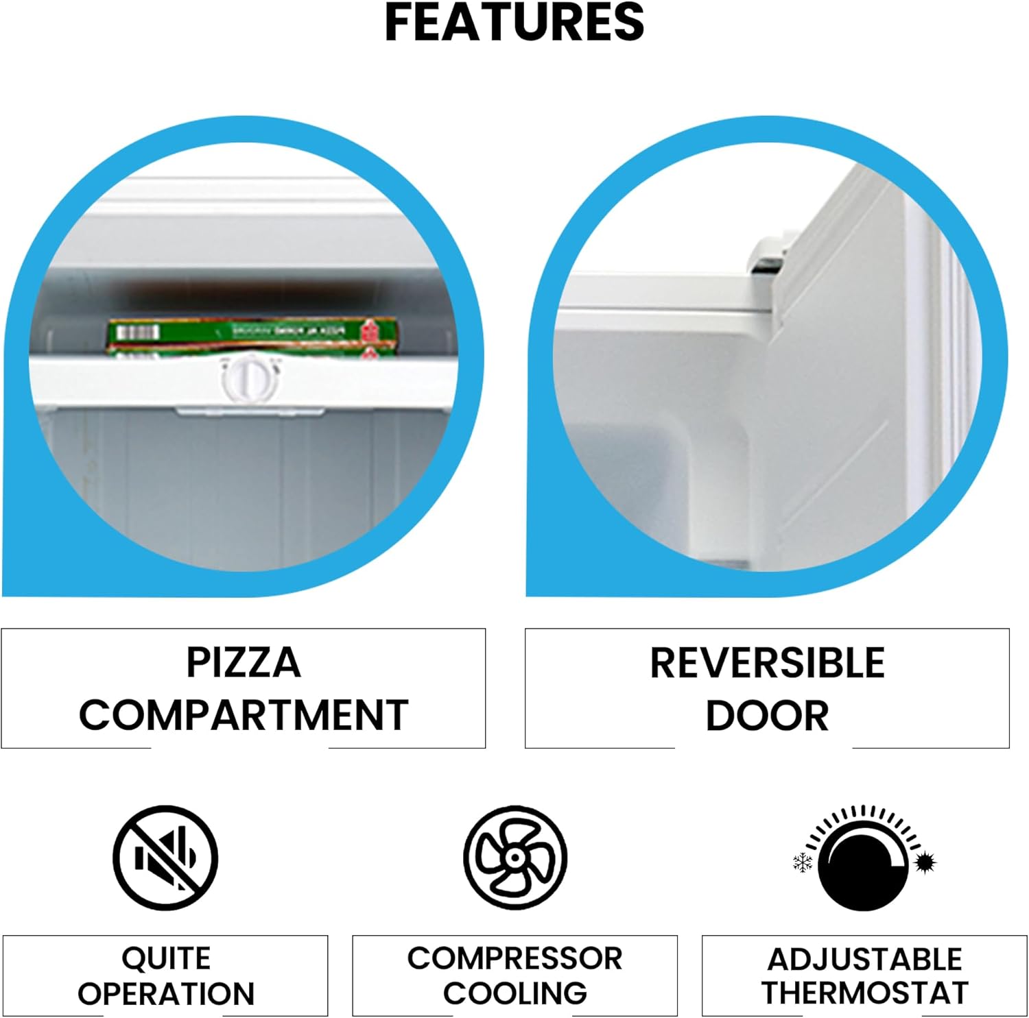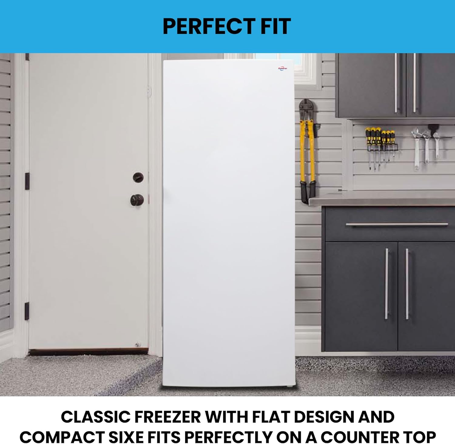 Garage-ready upright freezer is perfect for your basement or outbuilding: With premium insulation and technology to protect electrical components from extreme outside temperatures and maintain consistent operation, this "garage-ready" upright freezer is ideal for your garage, basement, or shed. Its generous 7.0 cubic foot (198 liter) capacity offers plenty of convenient storage for all your frozen goods so you can buy in bulk, reduce food waste and save money. Four removable tempered glass shelves let you organize your contents to be accessible when you need them and the unique top section is the perfect size for your favorite frozen pizzas. The classic white freezer features a space-saving flat back design with enclosed evaporator coils and a reversible door that can be installed to open left or right to suit your space. Reliable compressor cooling technology keeps contents at your desired temperature with a range of 0 to -24C (32 to -11.2F) with minimal frost build-up.