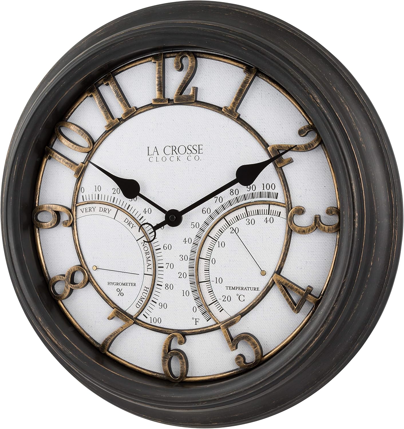 The La Crosse Clock courtyard clock operates indoors or outdoors with its weather seal, it is sure to please with almost any décor! Battery operated (not included) with accurate silent sweeping quartz movement. Plastic framework is resistant from moisture and UV-protected glass lens and dial. Equipped with a thermometer and a hygrometer, the clock also assesses and relates temperature and humidity levels to help users protect seedlings from frost, avoid over-watering finicky plants, and take precautions against an icy walkway. To ensure accurate readings, hang the clock in a dry area out of direct sunlight. This clock requires the separate purchase of one AA battery for operation.