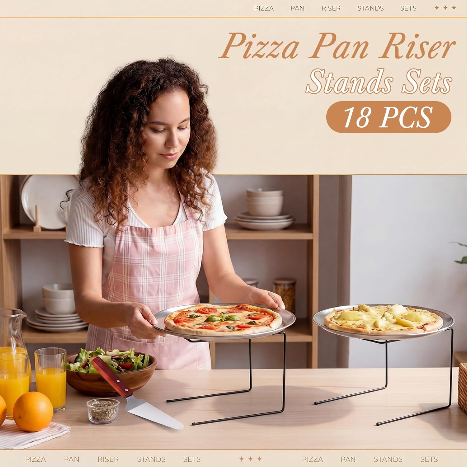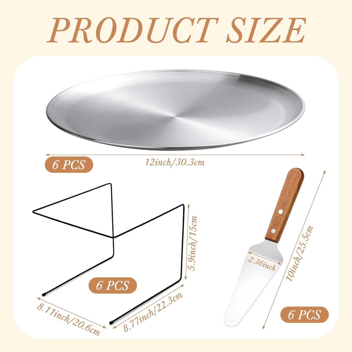Features: Versatile Scenes: 18-Piece Pizza Set includes 6 metal stands, 6 stainless steel pans, 6 wood-handle servers. Ideal for weddings, parties, cafes—elevate pizza/dessert presentation, suit home and commercial use. Premium Material Effortless Use: stainless steel pizza pans/servers ensure even heating & easy cleaning. Non-slip stands, heat-resistant wood handles fit 11-inch pizzas—reusable for multiple events. Specifications: Material: stainless steel Color: black and silver Size: pizza pans: 11.8 inches/30.3cm in diameter, 0.78 inches in thickness pie servers: 2.36 x 10 inches/6 x 25.5cm pizza stands: 8.11 x 8.77 x 5.9 inches/20.6 x 22.3 x 15cm Package includes: 6 x pizzas table stands 6 x wood handle pie server 6 x pizza pan Notes: Manual measurement, please allow slight errors on size. The color may exist a slight difference due to different screen displays