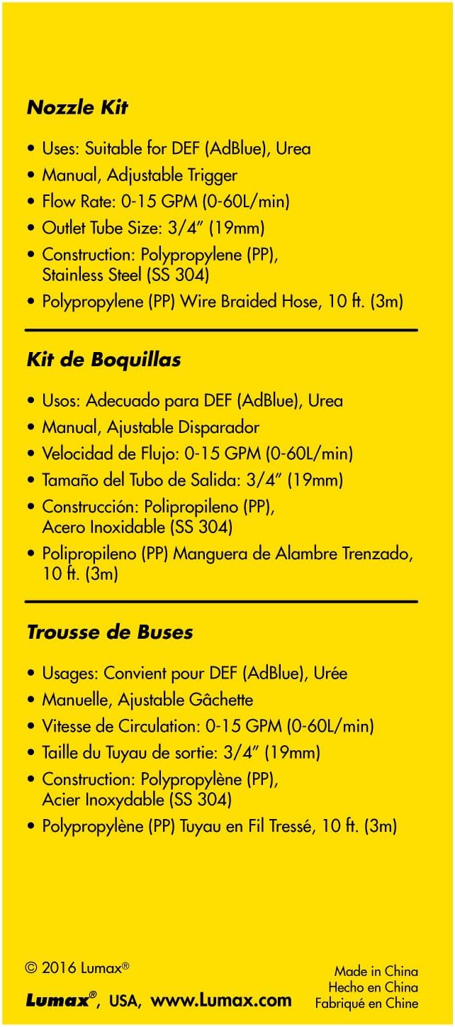 | Item Type Name | Lumax LX-1367 Nozzle Kit (for DEF, Ad Blue, Urea with 10' (3m) Wire Braided Hose). Manual, Adjustable Trigger Construction: Polypropylene and Stainless Steel Nozzle Kit. |