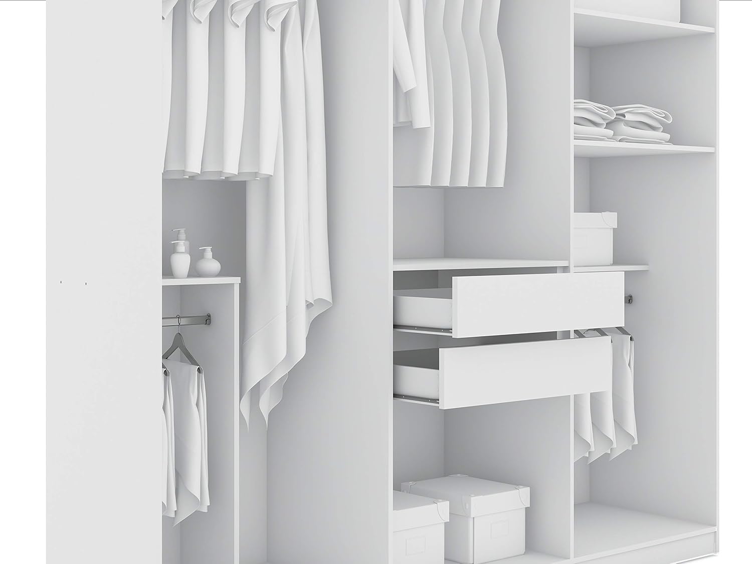 Elevate your bedroom organization with our versatile wardrobe closet with doors. Crafted with quality materials, this free standing closet cabinet offers ample storage for all your clothing and accessories. With multiple drawers and shelves, our wardrobe organizer ensures tidy and efficient use of space, perfect for bedroom closets of any size. The sleek design blends seamlessly into any decor, while the soft-close hinges ensure a quiet and smooth operation. Whether you need a closet system for walk-in closets or simply want to upgrade your bedroom closet, our storage closet provides the solution. Say goodbye to clutter and hello to effortless style with our bedroom armoires and wardrobes. Simplify your mornings and transform your space with this must-have closet wardrobe. Includes 2 Sections with 4 Cubby Spaces Featuring Adjustable Shelf Option, and 2 Aluminum Hanging Rods 15.4 Lb. Weight Capacity for the Aluminum Rod with a Hanging Depth of 21.5". Features Beautiful Sleek Wide Champagne Aluminum Handles. Finished Back for Room Divider Potential with No Wardrobe Legs. Closed Mop Base. Overhead Frame Dip For Extra Storage. Option to Add on Manhattan Comfort Modular Sectional Wardrobes for More Storage. Home Assembly Required. All Hardware Included.