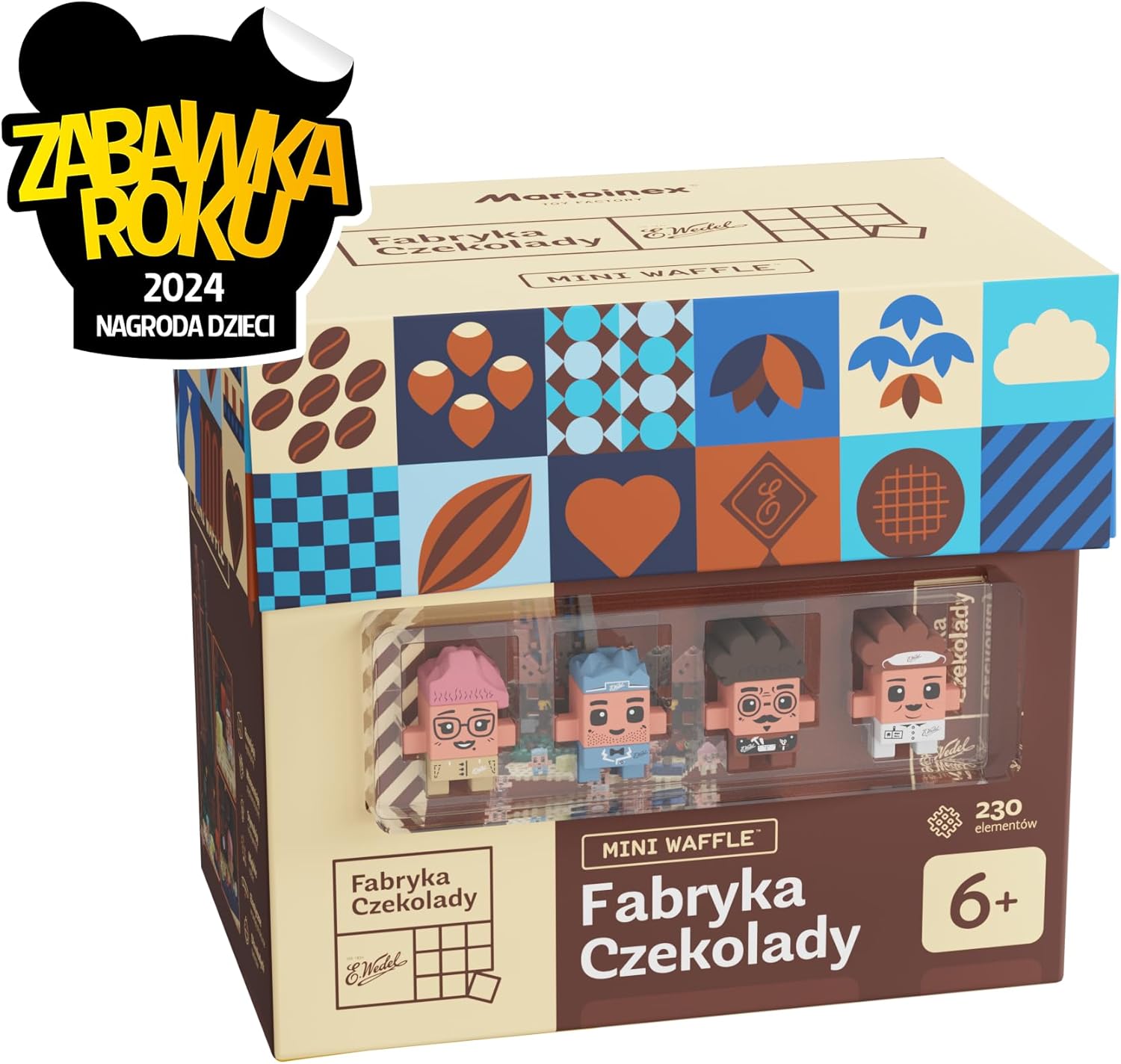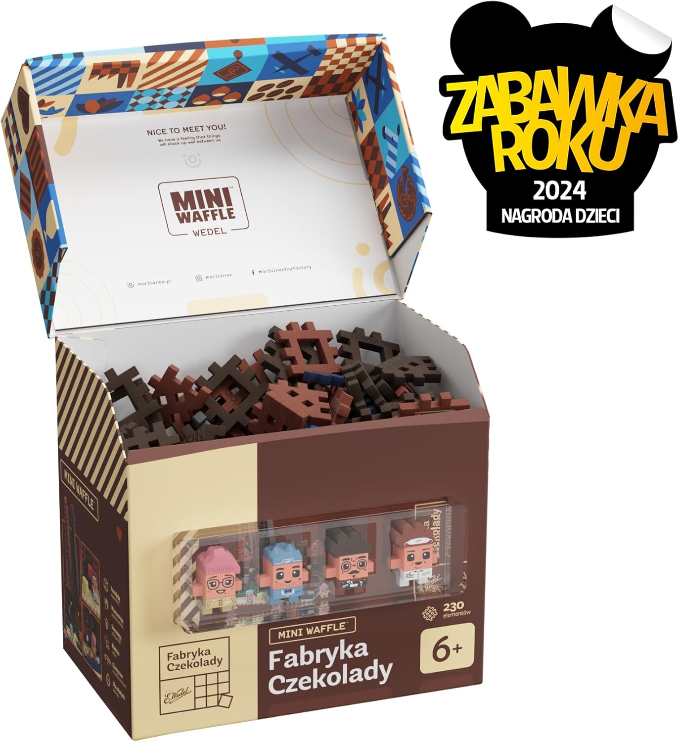 Wedel – The Chocolate Factory Wedla chocolate factory works in full steam to deliver sweets and save time to the inhabitants of Marioinex! Join the team who develops the recipe and prepares delicious chocolate artwork. Build your own Wedla chocolate factory and explore the process of creating these most popular inner candies. The Chocolate Factory Set will allow you to build a factory with distinctive chimneys and a production line that creates chocolate treats. The production cannot be done without ingredients: you can find them in special containers and use them to create your own sweets. Chocolate, Torcik Wedlowski or maybe your own idea? It all depends on your idea and imagination. The Mini Waffle Wedla Chocolate Factory Set is a great way to play together and develop your child's creativity and imagination. Together you will see how the chocolate is created in the factory that you can build with your own hands. You will also know the ingredients needed for its production such as cocoa beans. Get the fun of the Mini Waffle blocks through learning, combine sets from the Wedla series and create the cutest structures under the sun together! Zalety zestawu: ● Rozwijaj wyobraźnię i kreatywność swojego dziecka poprzez wspólną zabawę ● 100% bezpieczne materiały – certyfikowane ● Atrakcyjna, wielogodzinna zabawa nie tylko dla dzieci! ● Build shapes in 2D and 3D sets specification: ● Up to 230 pieces ● Step by step building instructions (56 pages) ● Innovative building blocks ● Building blocks made in Poland ● Blocks and packaging made from renewable materials in recycled ● For children aged 6 years and up