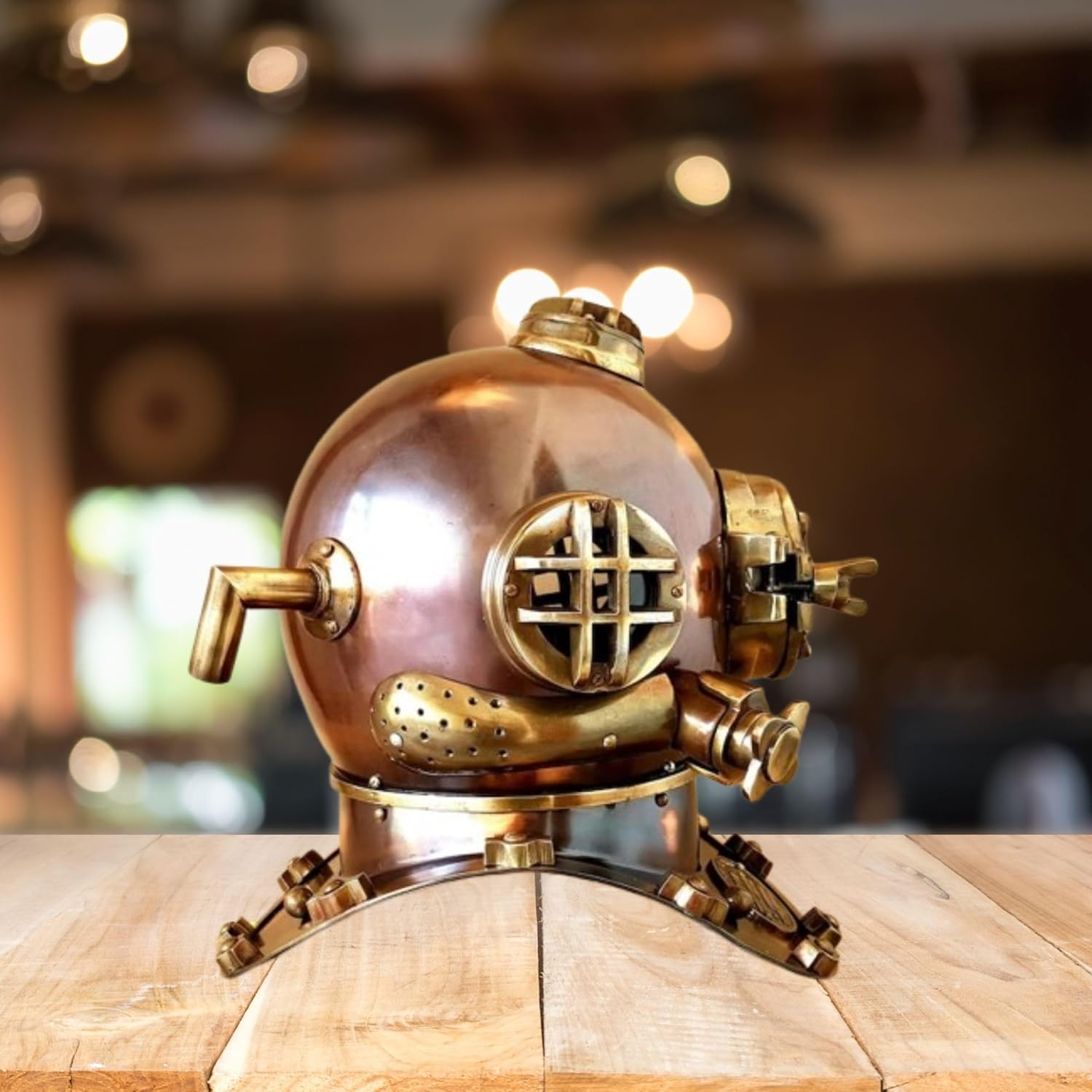 Dive into vintage maritime charm with this authentic full-size diving helmet, crafted from durable steel and measuring a substantial 18 inches. Whether used as a unique diving helmet decor, functional diving helmet desk clock, or striking diving helmet lamp, this piece captures the spirit of classic scuba gear with precise craftsmanship. Perfect for collectors, marine enthusiasts, or as a bold statement piece for your home or office, it’s more than a decoration — it’s a conversation starter. Featuring authentic dimensions (16" x 12.5" x 17") and weighing approximately 8.5 kg, this antique diving helmet replica stands out in any room. Stock is limited and demand is soaring — grab yours today before this trending nautical treasure dives away!