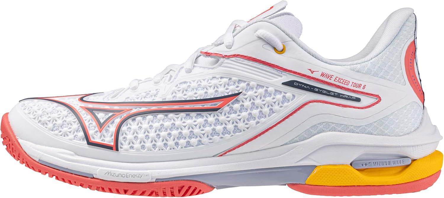 Re-engineered from the ground up, the All-New Wave Exceed Tour 6 AC continues to set the standard for premium performance racquet sports footwear. The next generation of MIZUNO ENERZY, ENERZY NXT - the lightest and most responsive ENERZY material yet - is integrated in the midsole at the forefoot to deliver explosive speed and change of direction for optimum performance and ultimate energy return. An updated MIZUNO WAVE® plate and an expanded D-Flex Groove, greatly increase lateral stability and help turn your power into speed around the court. One of the lightest and fastest shoes on the market, the Wave Exceed Tour 6 utilizes the new Dyna-Fit Eyelet and a redesigned and cushioned tongue to elevate the level of comfort and fit for the advanced tennis and pickleball player. The new DuRubber outsole provides the ability to both slide and stop while maintaining the luxury of a 6-month outsole guarantee. Exceed your expectations in the All-New Mizuno Wave Exceed Tour 6 AC.