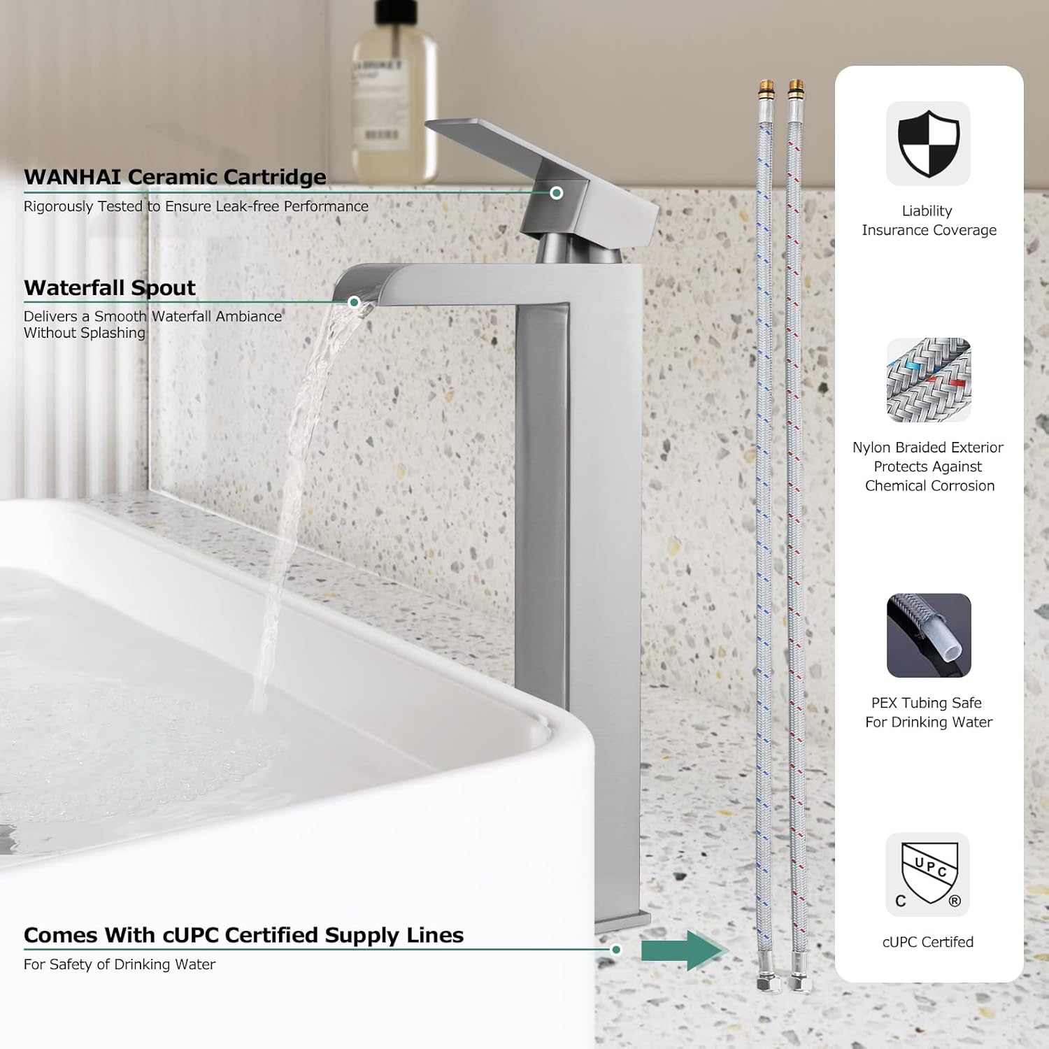 PARLOS Single Handle Waterfall Vessel Sink Faucet with Pop-up Sink Drain(with Overflow), cUPC Certified Water Supply Lines.