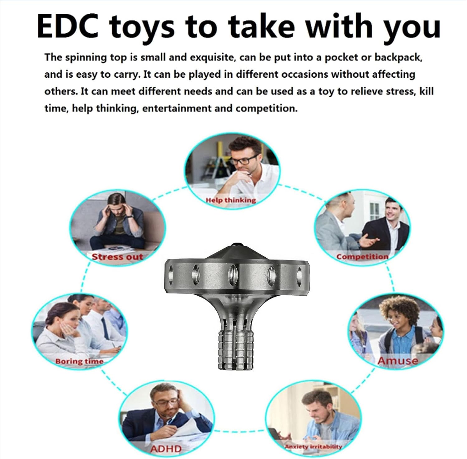 About Us: We mainly concentrated on designing, Manufacturing and selling of physics toys. Hope our products can bring you endless pleasure.Best Gift: The top is a very meaningful gift, memories of childhood, precious friendship, you can send it as a gift to your friends or relatives and so on.Durable: The silicon nitride bearing in all of our spinning tops offer superior wear resistance. well made, no scratches, no signs of the machine, perfectly balanced.Knurled Upper Top Body: Knurling on the stem allows for a high-torque rip to develop high RPMs at launch, At the same time easier to spin.Spin Long Time: After practicing, a skilled adult could spin it for 5-8 minutes easily. A perfect gift for every spinning top lover.High Performance: this is a terrific looking, high performance spinning top. Launches easily, settles quickly, and spins Quiet smoothly. High Quality: We inspect and test each top carefully (and violence test was introduced too) to ensure you have a good shopping experience. Large Size: Large size titanium alloy gyro, because of its low density and light weight, it is easy to use for novices. When you are technically skilled and your finger strength is large enough, the large size will have a very long rotation time and perfect balance performance. Overall Dimensions: 1.35 inch x1.38 inch(Diameter x High) Net Weight: 0.78 oz Material: TC4 titanium , silicon nitride ceramic beads Packing list: Spinning top x1 + tarpaulin pouch