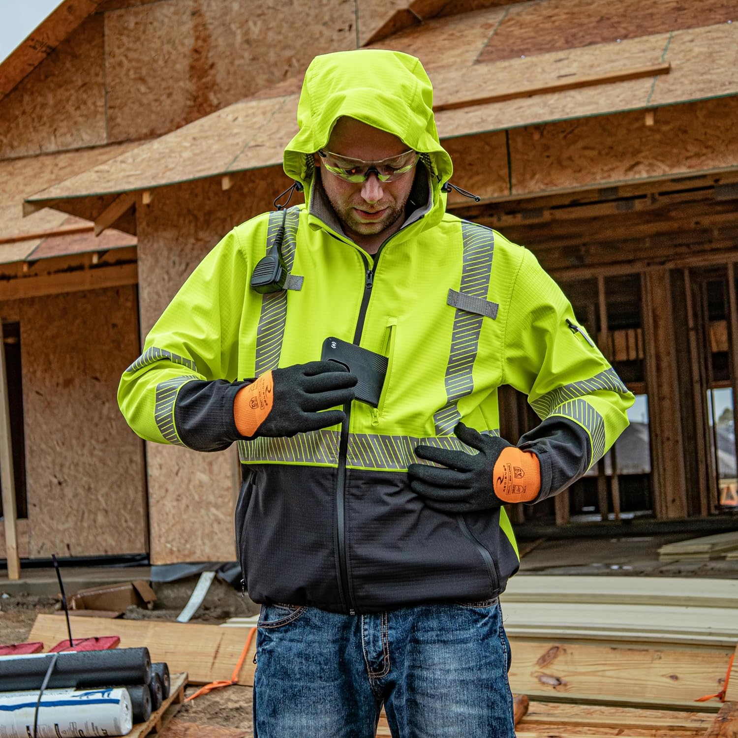 Stay warm, dry, and visible on the job with the Radians SJ322B Type R Class 3 High Visibility Ripstop Softshell Jacket. This class 3 winter jacket is designed to keep you comfortable and protected. Made with a durable tri-laminate ripstop polyester and a cozy fleece lining, this jacket features a Thermoplastic PU membrane that ensures you stay warm and dry. The jacket's segmented heat transfer tape is lightweight yet highly reflective, providing added safety. With waterproof zipper closures and ANSI/ISEA 107 Type R Class 3 compliance, this jacket is perfect for those working in demanding environments. Additionally, the adjustable and removable hood, multiple pockets, and mic tabs make this jacket practical and functional for any worker.