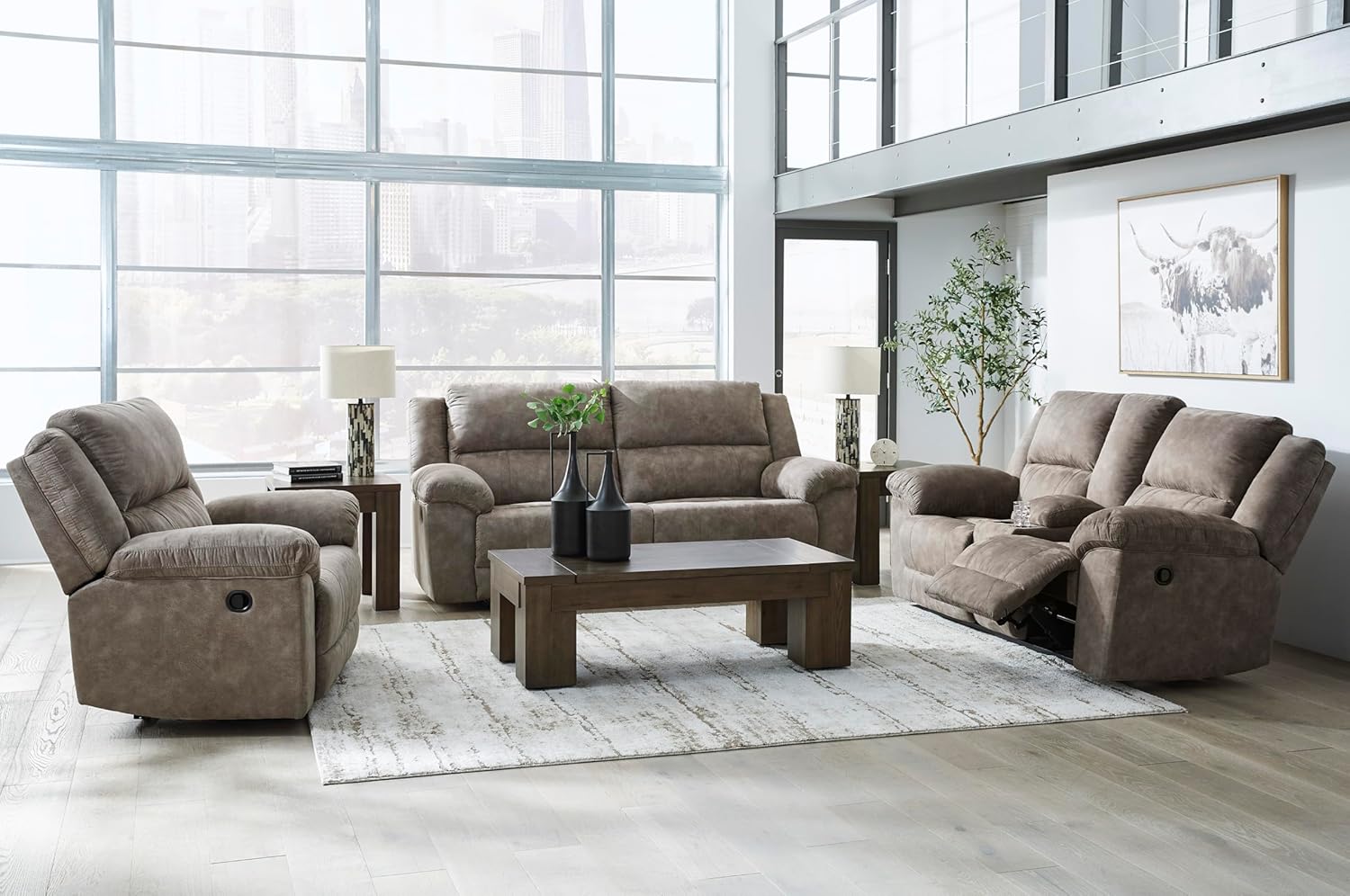 Is being too comfortable even possible? It’s worth finding out in this reclining loveseat with console. Wrapped in the plushest of neutral faux leather upholstery, it's perfectly cushioned in all the right places. We love the loveseat's super-wide seating, with plenty of room for two to cuddle up. A center console with cup holders and storage blend form and function. And its effortless reclining elevates your comfort level into the stratosphere.