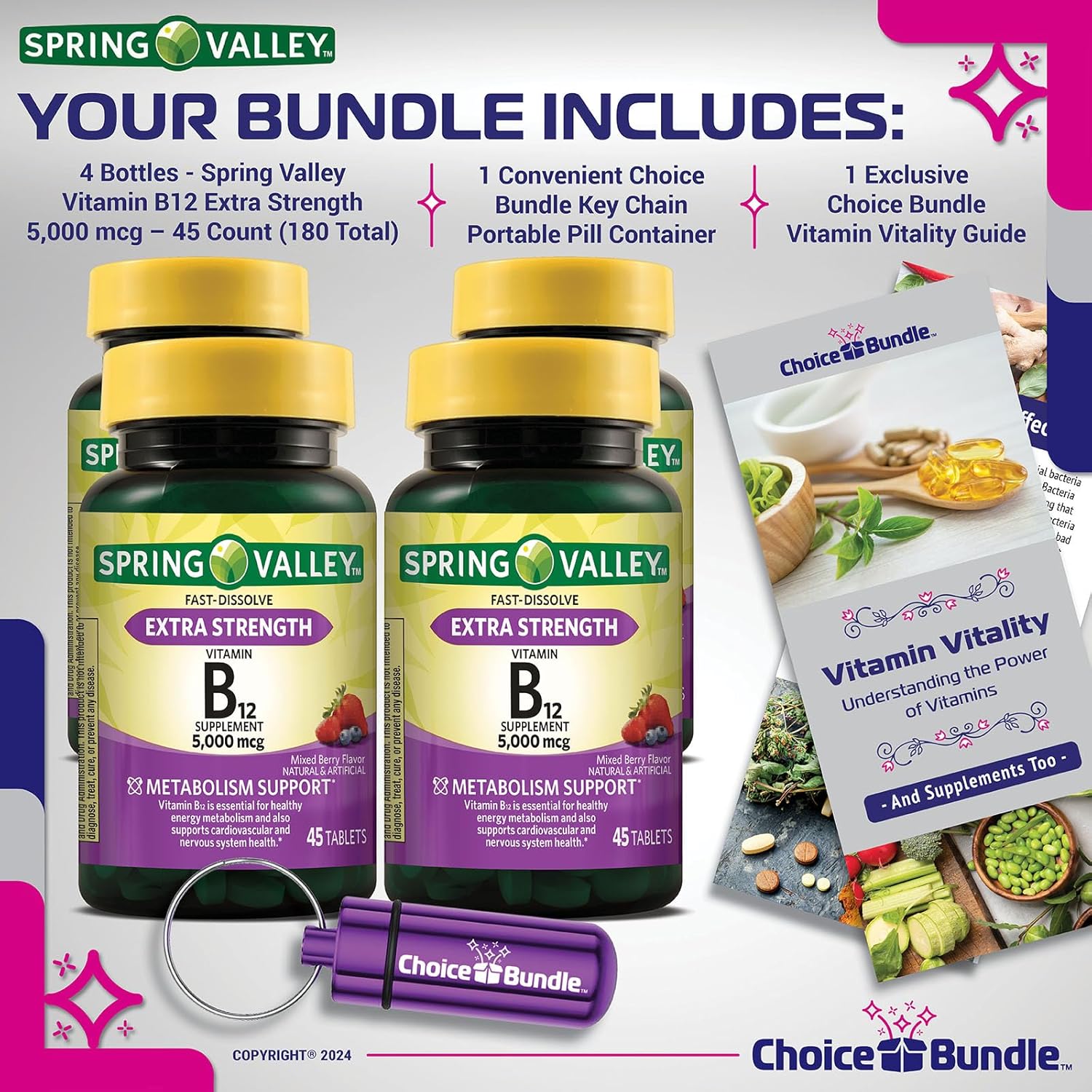 4 Bottles - Spring Valley Extra Strength Vitamin B12 Metabolism Support Dietary Supplement Fast Dissolve Tablets, Mixed Berry, 5000 mcg, 45 Count. Spring Valley Extra Strength Vitamin B12 Metabolism Support Dietary Supplement Fast Dissolve Tablets may help support energy metabolism, cardiovascular, and nervous system health.* Vitamin B12 may be essential for healthy energy metabolism and also support cardiovascular and nervous system health.* The suggested adult dosage is one tablet daily, preferably with a meal, dissolved under the tongue for 30 seconds, and then swallowed. These quick-dissolve tablets contain no gluten, wheat, milk, eggs, fish, crustacean shellfish, tree nuts, peanuts, soybeans, yeast, artificial colors, or added preservatives. You can rest assured that our Spring Valley Extra Strength Vitamin B12 Metabolism Support Dietary Supplement Fast Dissolve Tablets are produced with strict quality guidelines and backed by our quality guarantee. Vitamin B12 Product Details: - Metabolism support supplement* - Fast dissolve extra strength vitamin B12 - 5,000 mcg per tablet - No gluten, wheat, milk, eggs, fish, crustacean shellfish, tree nuts, peanuts, soybeans, or yeast - No artificial colors or added preservatives - Mixed berry flavor - 100% vegetarian - Tamper-evident packaging These Vitamin B12 Fast Dissolve Tablets contain no: - No gluten - No wheat - No milk - No eggs - No fish - No shellfish - No tree nuts - No peanuts - No soybeans - No yeast - No preservatives The Metabolism Support Fast Dissolve Tablets contain: - 5000 mcg of Vitamin b12 *These statements have not been evaluated by the Food and Drug Administration. These Spring Valley Extra Strength Vitamin B12 Metabolism Support Dietary Supplement Fast Dissolve Tablets, are not intended to diagnose, treat, cure or prevent any disease. Includes Exclusive " Vitamin Vitality – Understanding the Power of Vitamins" Guide designed to educate customers about vitamins and dietary supplements. Also includes Pill Buddy convenient, portable Pill Container for your keychain.