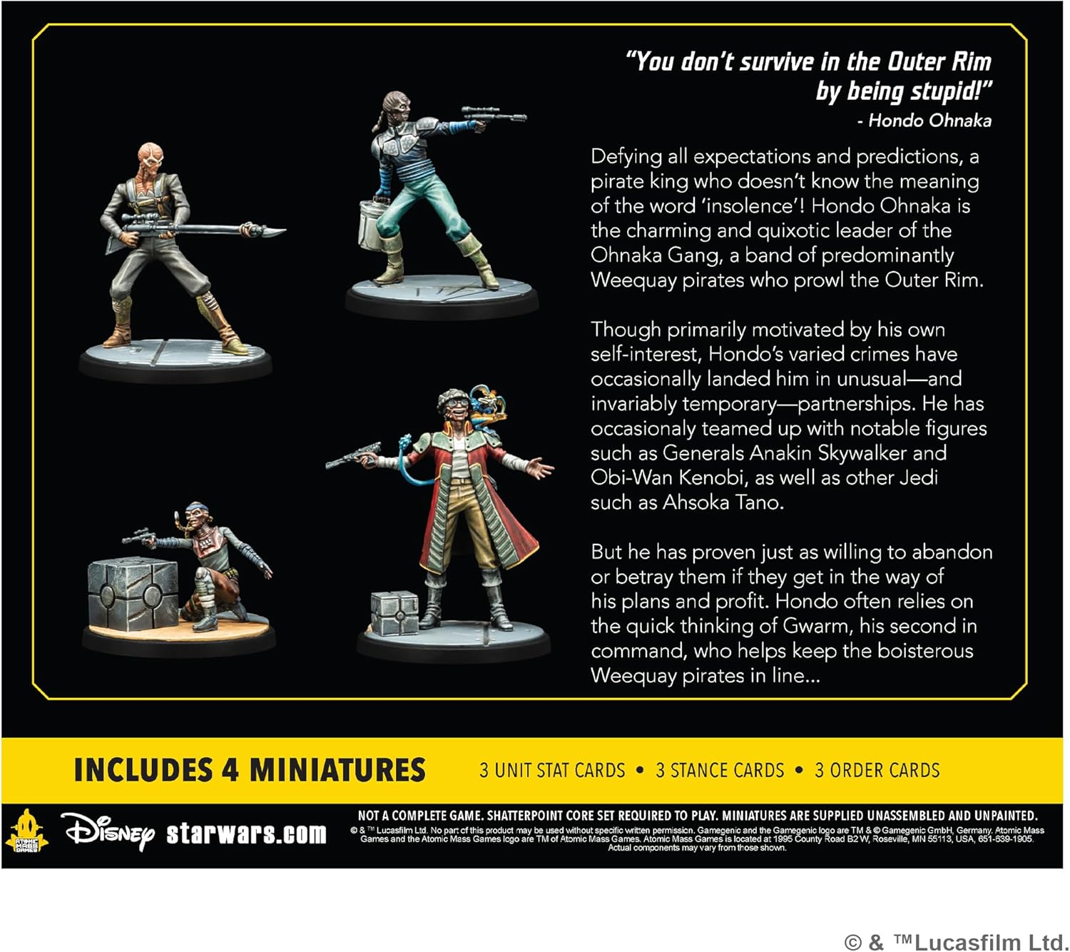 A legendary pirate and his band of outlaws join Star Wars™: Shatterpoint in this new Squad Pack! Hondo Ohnaka is the charming and quixotic leader of the Ohnaka Gang, and this pack adds him to the game as a new Primary Unit in the Clone Wars era. He is joined by his second-in-command Gwarm as a Secondary Unit and a pair of Weequay Pirates as a Supporting Unit to help him carrying out his schemes. In addition to beautifully sculpted miniatures of these characters, this pack also contains all the Stat, Order, and Stance cards players need to add them to their Star Wars: Shatterpoint squads.