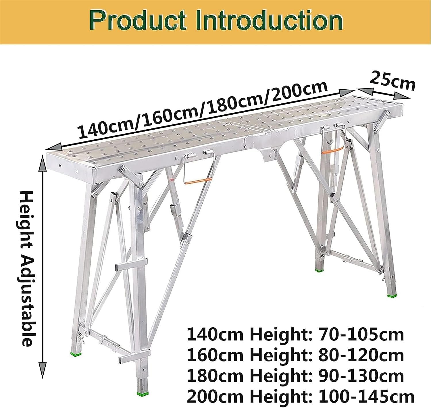 Multifunctional: This portable sofa can be used for home decoration, DIY, vehicle washing, cleaning, holding high things, painting Product parameters: Material: Steel Load capacity: 400 kg or more Product size: - 140cm: Length: 140cm; Width: 25cm; Adjustable height: 70-105cm; - 160cm: Length: 160cm; Width: 25cm; Adjustable height: 80-120cm; - 180cm: Length: 180cm; Width: 25cm; Adjustable height: 90-130cm; - 200cm: Length: 200cm; Width: 25cm; Adjustable height: 90-145cm; Feature: The unique design combines the functions of scaffolding and ladders, not only ideal for washing cars, but also ideal for painting walls and cleaning. Heights are adjustable to meet different needs. Made of high quality thickened steel, which is stable and can hold over 400 kg. Foldable design, portable and easy to store. The surface of the scaffolding equipment is designed with small holes to increase safety, slip resistance and stability. Package: 1x Folding Scaffolhint: 1. Due to different monitors and lighting effects, the actual colour of the item may be slightly different from the colour on screen. Thanks! 2. Please allow 1-3 cm difference due to manual measurement.