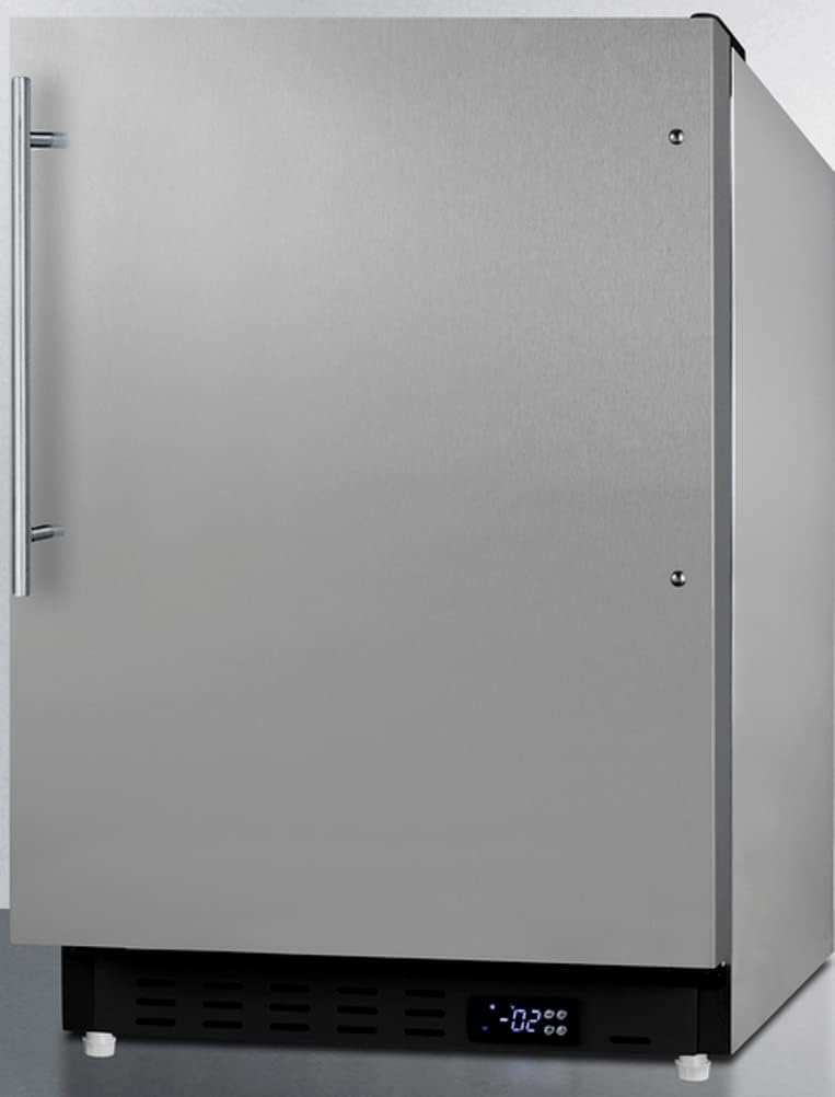 Summit Appliance ALFZ37BCSSHV Built-in Undercounter ADA Compliant Residential All-Freezer with Stainless Steel Cabinet, Vertical Handle, Door Storage, Adjustable Thermostat and Manual Defrost The ALFZ37BCSSHV is sized at 32" high to fit under lower counters complying with ADA guidelines for accessibility. The fully finished stainless steel cabinet allows freestanding use, while the front-breathing system means this unit can be built-in with minimum clearance. This unit comes with a right angle cord to allow for easier placement without added depth. A digital thermostat, located in the kickplate, makes for easy temperature management with a readout in Fahrenheit or Celsius. Key Features - Just 32" high for an easy fit under lower ADA compliant counters - Flexible design allows built-in or freestanding use in 20" wide spaces - Stainless steel wrapped cabinet and door provide a durable, elegant look - Three removable door racks for additional storage of larger items - Three adjustable wire shelves for optimal storage in 2.68 cu. ft. interior Specifications - Height of Cabinet: 31.75" - Height to Hinge Cap: 32" - Width: 19.88" - Width with Door Open: 20.88" - Depth: 22.5" - Depth with Handle: 24" - Depth with door at 90°: 40.25" - Capacity: 2.68 cu.ft. - Defrost Type: Manual - US Electrical Safety: ETL - Canadian Electrical Safety:ETL-C - Energy Usage/Year: 266kWh/year - Amps: 0.6 - Voltage/Frequency: 115V AC/60Hz - Interior Height: 23.75"x14.5"x17" - Full Door Shelves: 3 - Adjustable Shelves: Yes - Thermostat Type: Digital - Fan Type: Exterior - Refrigerant Type: R600a - Refrigerant Amount: 1.83 oz - High Side PSI: 180 - Low Side PSI: 80 - Level Legs: 2 - Wheels: 2 - Compressor Step: 5.75"x14.5"x6" - Temperature Range: -13 to 5ºF - Sound Level: 33.1 dBa - Weight: 105 lbs - Shipping Weight: 110 lbs