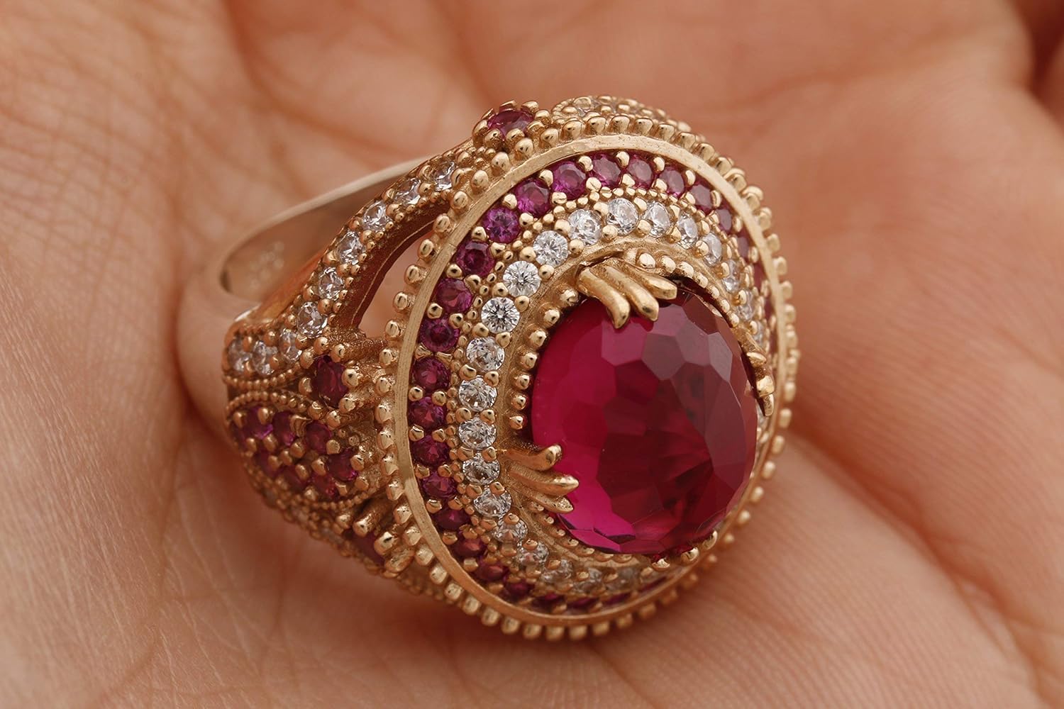 Stone : Pink Ruby and Topaz Stone Color : Pink Weight : 9.5 grams Size : 0.95 inch diameters Material : 925 K Sterling Silver and Bronze Production : Fully Handmade Turkish Authentic Jewelry Oval Shape Cut Topaz 925 Sterling Silver Band Ring. Crafted with precision by skilled Turkish artisans, this exquisite ring exudes authenticity and traditional craftsmanship. Adorned with round-cut topaz stones, the ring boasts a captivating design combining elegance and sophistication. The vibrant hues of the gemstones are beautifully complemented by the lustrous 925 sterling silver band, adding a touch of luxury to any ensemble. This stunning ring is a fashion statement and a meaningful gift for the special woman in your life. Whether it's a birthday, anniversary, or any other occasion, this ring is sure to delight and impress. Available in various sizes, it ensures a perfect fit for every wearer. Make a statement of elegance and beauty with our Handmade Turkish Authentic Jewelry Oval Shape Cut Topaz 925 Sterling Silver Band Ring. Add it to your collection or gift it to someone special to cherish for a lifetime. This description highlights the craftsmanship, design, materials, versatility, and suitability as a gift for women.