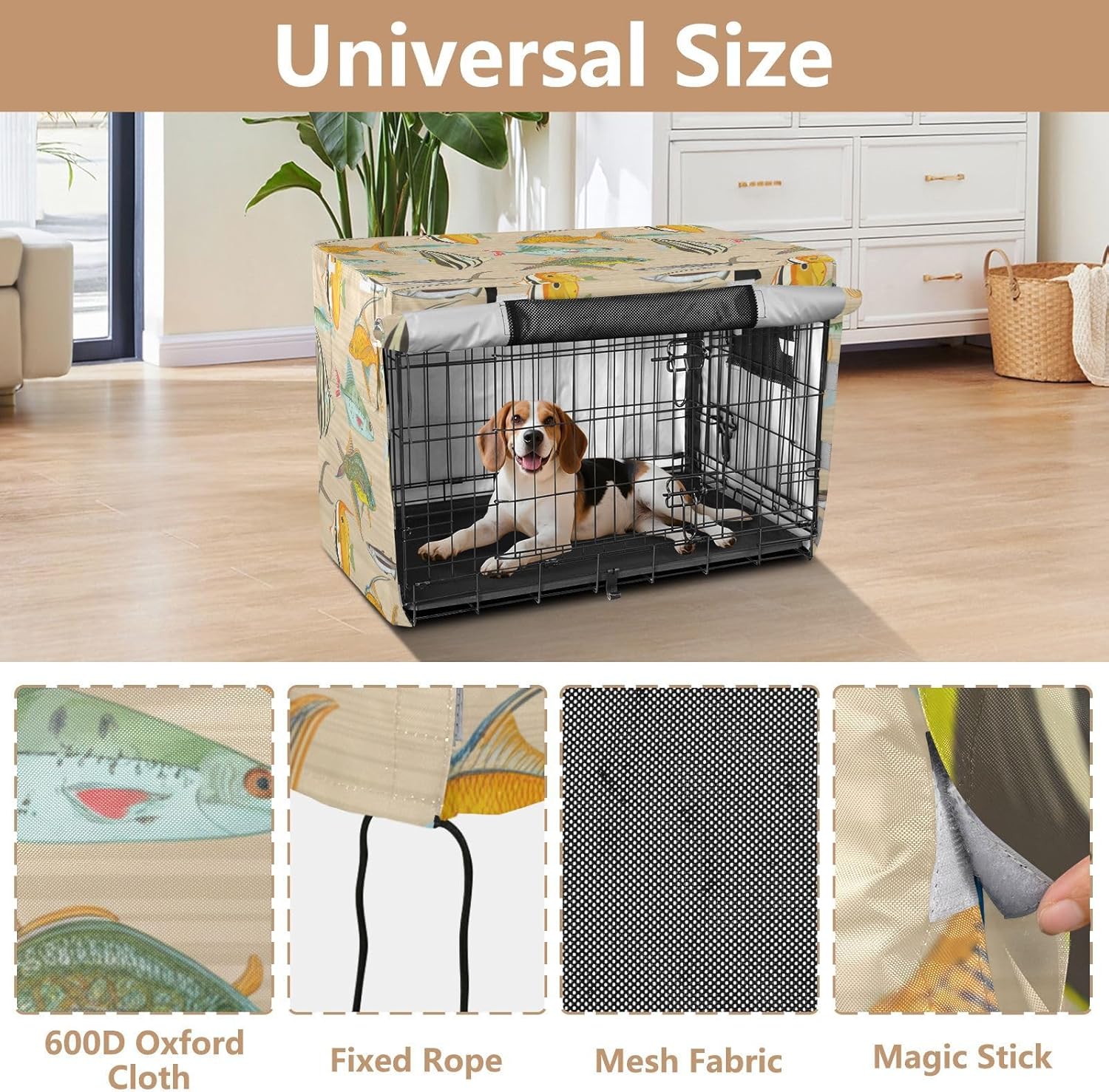 Premium Protection – Constructed from 600D silver-coated oxford fabric, this dog crate cover offers excellent protection from rain, wind, and sunlight. It helps prevent scratching and keeps your pet’s crate protected from external elements.Quick Setup – This dog kennel cover is designed for easy installation, with a simple fastening system that ensures a secure fit without the need for tools or extra help.Mesh Windows for Comfort – This dog cage cover includes mesh windows on all sides, promoting airflow to keep your dog cool and comfortable while providing privacy and a sense of security inside the crate.Secure and Stable – With four tie-down straps at the bottom, this travel pet crate cover remains securely in place, even during windy conditions. This feature ensures that your dog’s crate is stable and protected from the elements.Flexible Usage – This pet crate cover is suitable for both indoor and outdoor use, making it a Suitable solution for protecting your pet's crate whether at home, during travel, or on outdoor adventures.