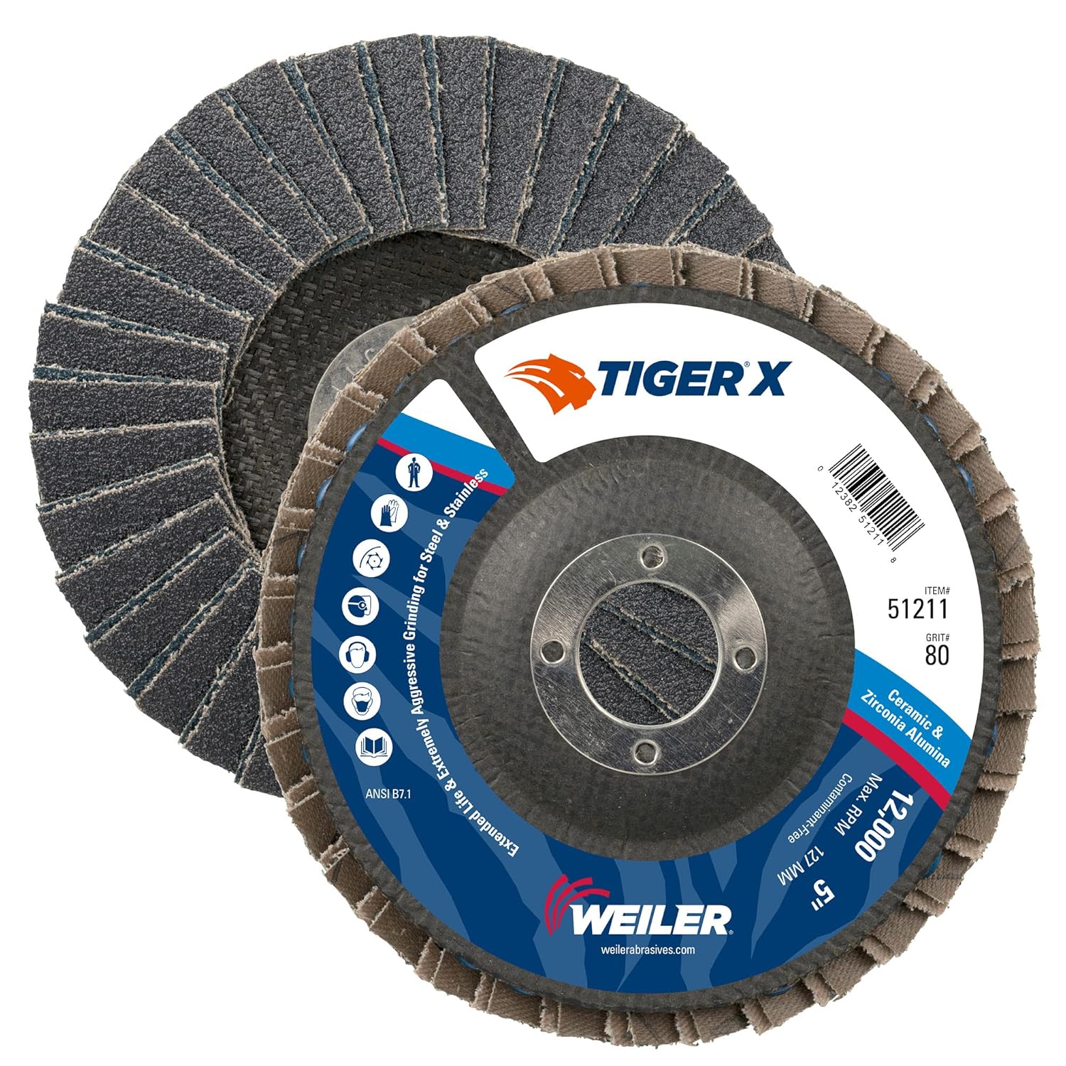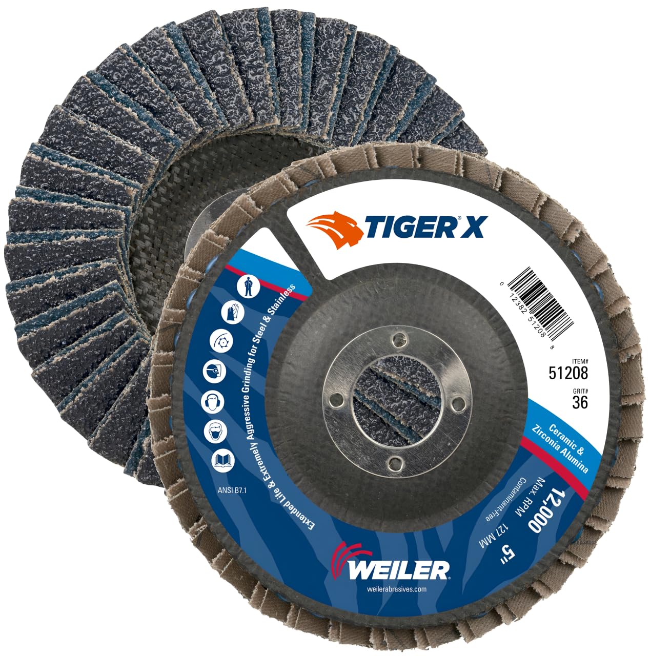 Tiger X flap disc raises the bar for those who are driven to get the job done right and done fast. Tiger X holds nothing back with its industry-first X3 technology that combines an advanced anchoring system, dual flap design and engineered backing. The combination delivers fast grinding AND long disc life for increased productivity. Tiger X features industry-first X3 technology that combines an advanced grain anchoring system, dual flap design and engineered backing that delivers faster grinding AND longer life when used on steel and stainless steel. Tiger X delivers the ultimate productivity enhancing X-Factors so you can do more in less time while lowering your consumable costs. Increased Productivity – The combination of aggressive grinding and long disc life deliver the ultimate X factor, a disc that gets more done in less time. Lower Consumable Costs – The combination of extreme aggressive grinding and long disc life means you get more for your money. Enhanced Worker Safety – Increased aggression lets professionals use less force to get equal or better results. This means less stress and reduced fatigue. Greater Versatility – X3 technology allows for greater versatility, reducing the need to switch discs when changing applications.