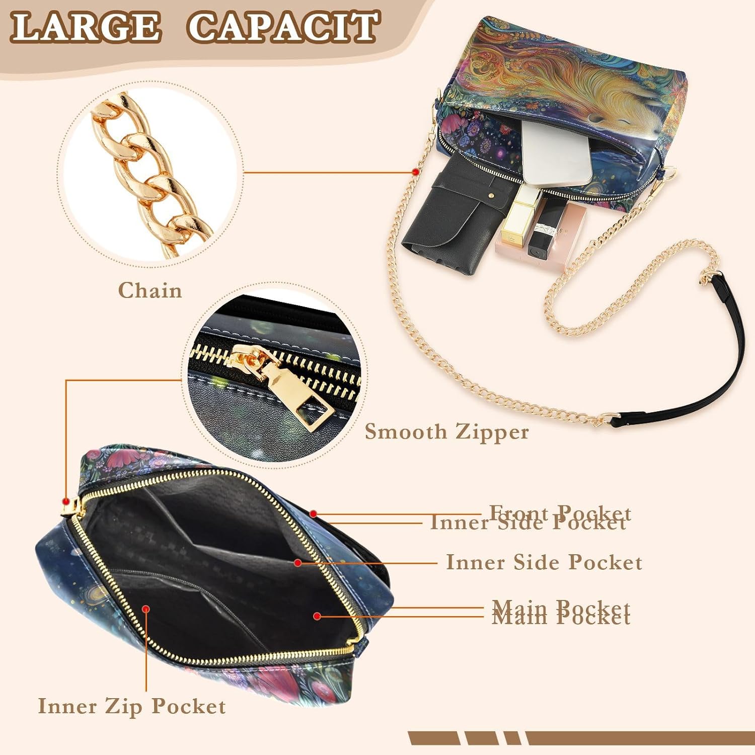 Made from soft and easy-to-clean PU leather, it withstands daily wear while maintaining its chic look. The interior features a zippered main compartment, a slip pocket, and a secure inner zipper pocket to keep belongings organized. The elegant adjustable metal chain strap offers comfortable wear at preferred length. Built with sturdy metal parts for durability.