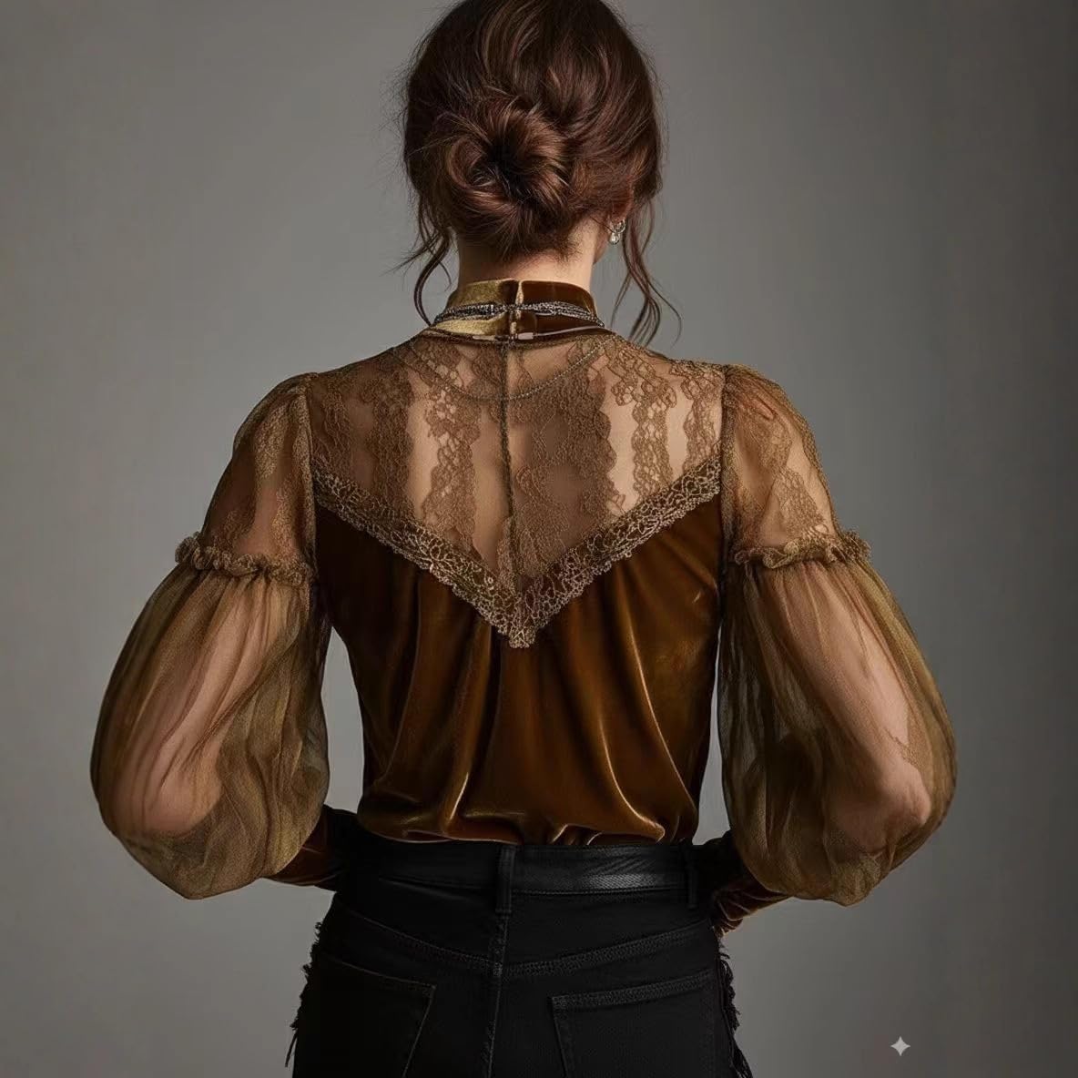 Product Features: Material: Made from high-quality gold velvet, this blouse feels soft against the skin and offers a lush, opulent appearance that is sure to turn heads.Design: The intricate lace patchwork adds a delicate contrast to the rich velvet, providing an elegant and sophisticated look.Sleeves: Featuring distinctive balloon sleeves, this blouse delivers a fashion-forward touch while maintaining comfort and ease of movement. Styling Suggestions: Pair this blouse with a sleek pair of high-waisted trousers or a fitted pencil skirt to create a chic and polished ensemble. For a more relaxed look, match with high-waisted jeans and ankle boots. Accessorize with gold jewelry to complement the blouse's rich tones. Summary: The Retro Gold Velvet Lace Patchwork Balloon Sleeve Blouse is not just a piece of clothing but a fashion statement. Its luxurious materials and elegant design make it perfect for both special occasions and sophisticated everyday wear. Enhance your wardrobe with this stunning blouse and embrace its timeless charm.