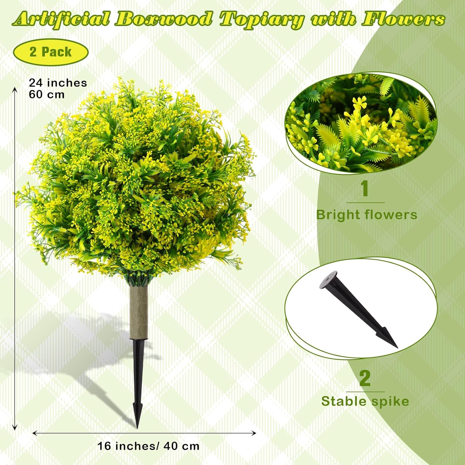 Specification: Features: Easy Installation: with no tools required, just attach the ground spike to the trunk and place it wherever you prefer. These outdoor faux plants are easy to push in the ground or pot In order to facilitate transportation, use compressed packaging. After opening, you can stretch them manually to make them fluffy Specifications: Material: plastic Color: yellow Size: 23.62 x 15.75 inches/ 60 x 40 cm Package includes: 2 Pack artificial flowers Notes: Due to the different monitor and light effect, the actual color may be a little different from the pictures. Since the size above is measured by hand, the size of the actual item you received could be slight different from the size above.